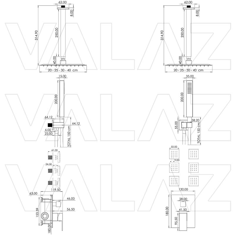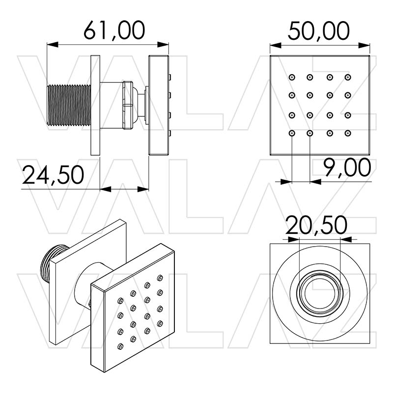 Rociador cuadrado disponible en 20x20 cm, 25x25 cm y 30x30 cm con soporte a pared