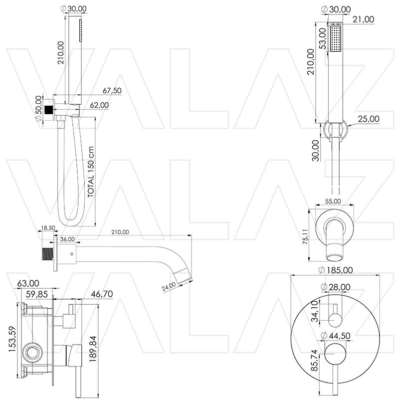 Monomando de 2 vías (alcachofa de mano, caño grifo de 21 cm).