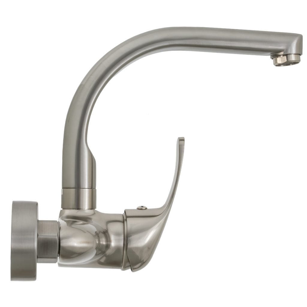 Grifo de cocina a pared acabado acero cepillado, ideal para instalar en el fregadero sencillo y minimalista. Su caño giratorio permite una gran libertad de movimiento para facilitar el uso diario en la cocina.