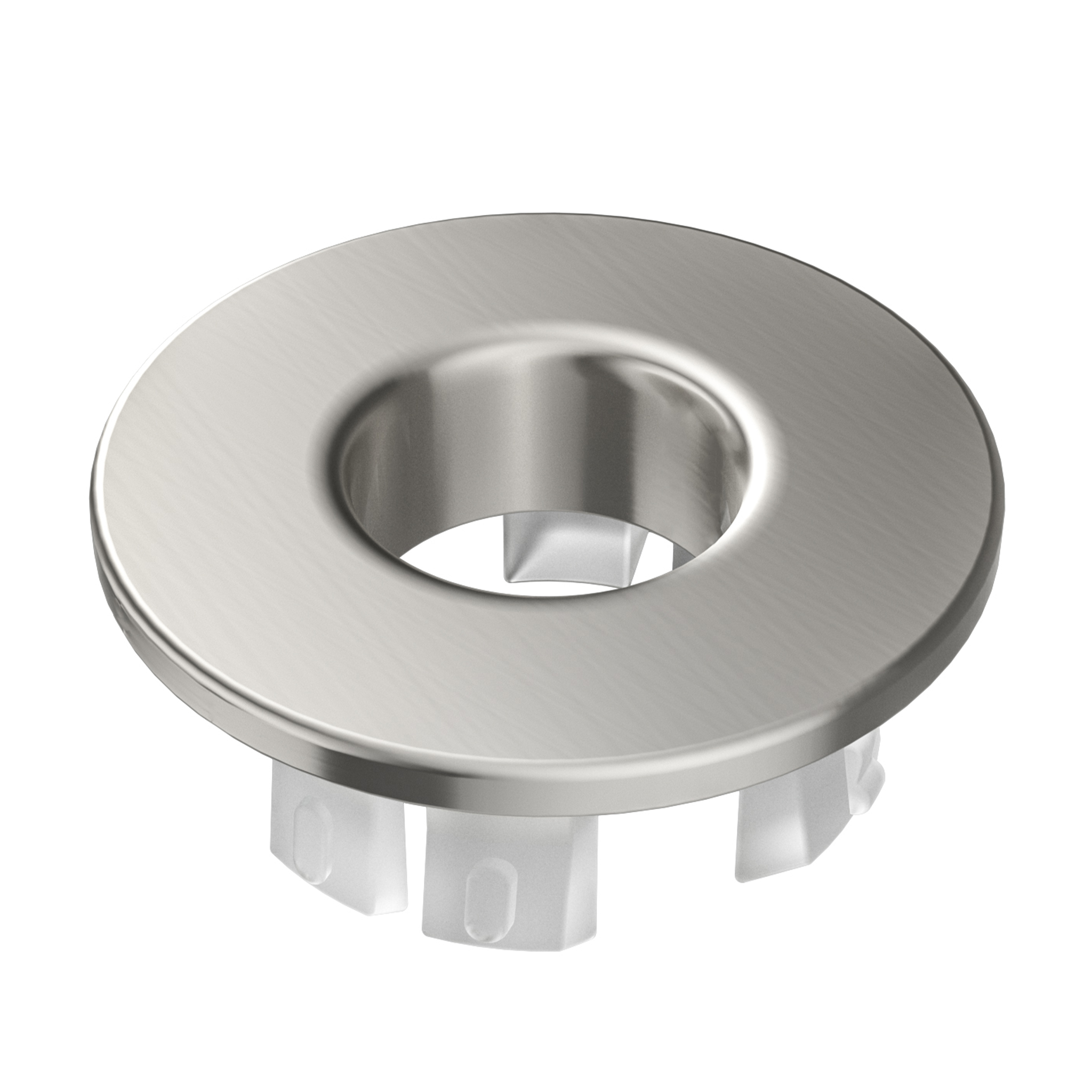 Embellecedor resistente con acabado acero cepillado, ideal para dar un toque elegante y limpio al lavabo. Fácil instalación y ajuste perfecto. Especificaciones: Material: Metal Acabado: Acero cepillado Uso: Rebosadero de lavabo