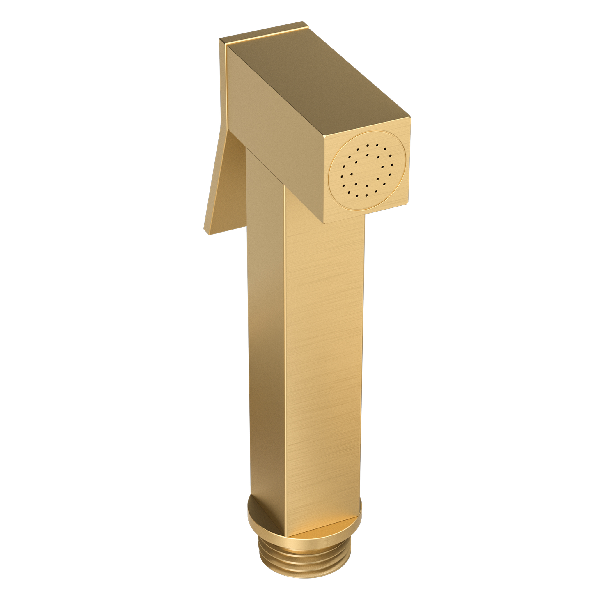 Spray empotrado de diseño cuadrado con acabado oro mate y protección PVD, que garantiza mayor resistencia a la corrosión y durabilidad. Ideal para una higiene eficiente y un estilo moderno en el baño.