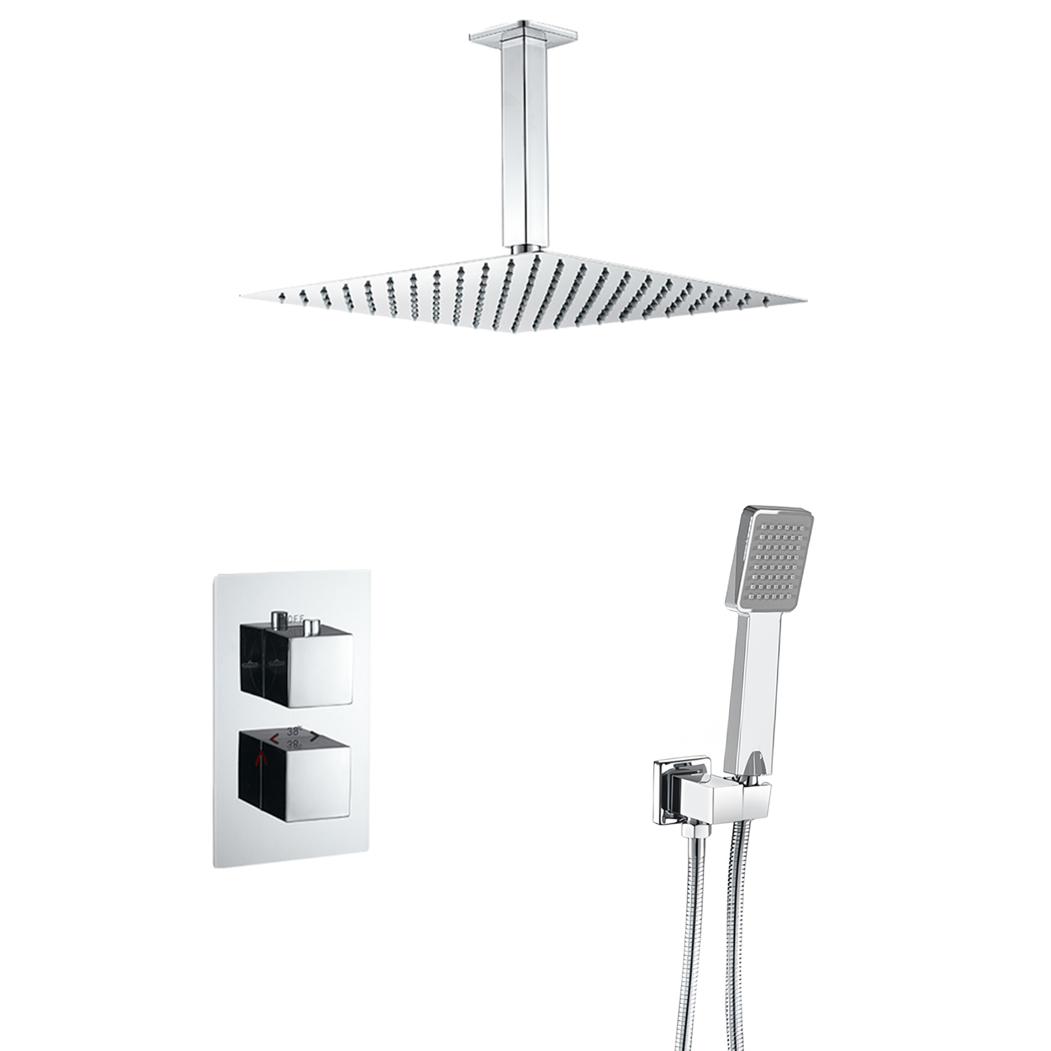 La Ducha empotrada termostática techo cuadrada de la serie Eresma combina diseño moderno con funcionalidad. Con un acabado cromado, esta ducha ofrece una experiencia de baño de lujo gracias a su rociador de gran tamaño y la versatilidad de su termostática. Especificaciones: Incluye: Rociador cuadrado disponible en tamaños 20x20 cm, 25x25 cm, 30x30 cm y 40x40 cm con soporte a techo Termostática de 2 vías (rociador efecto lluvia y alcachofa de mano) Flexo de 150 cm Alcachofa de mano con soporte Caja box empotrable Materiales: Rociador de acero inoxidable Monomando de latón Alcachofa de mano de PVC Flexo de acero inoxidable Acabado: Cromado Funciones: Efecto lluvia del rociador Alcachofa de mano Con el termostático, puedes disfrutar de un control preciso de la temperatura, mientras que el rociador de gran tamaño ofrece una experiencia de lluvia relajante, y la alcachofa de mano agrega funcionalidad extra para un uso cómodo y flexible. El acabado cromado añade un toque de elegancia a tu baño.