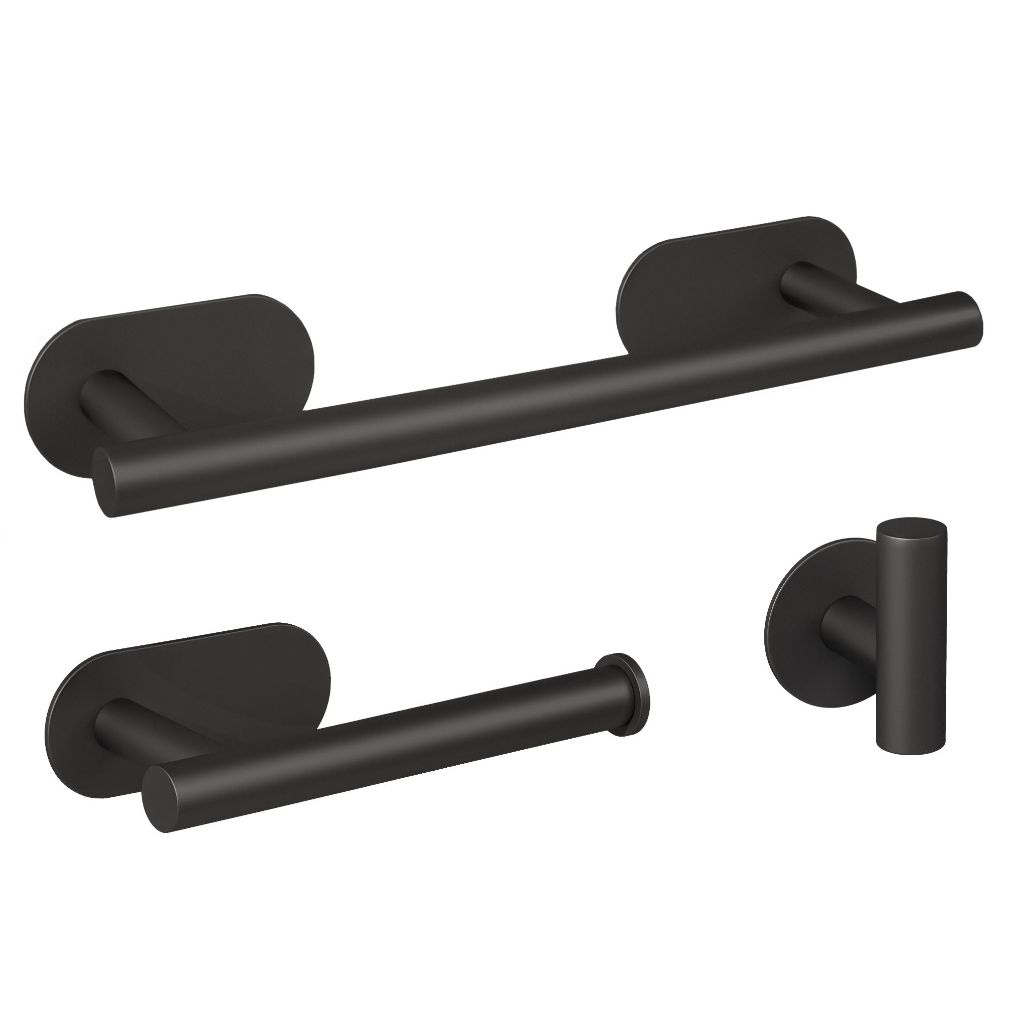 Accesorios modernos con acabado negro mate, fabricados en acero inoxidable SUS304 para garantizar resistencia y durabilidad. Instalación adhesiva sin perforar, ideal para mantener la estética de tu baño.