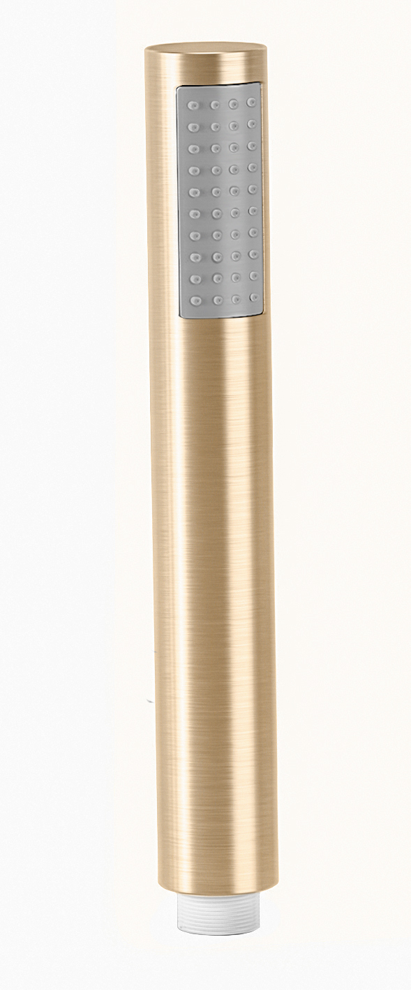 Alcachofa de mano de diseño fino y redondo con acabado en oro mate y protección PVD, que garantiza mayor resistencia al desgaste y la corrosión. Ideal para complementar griferías y duchas de lujo.