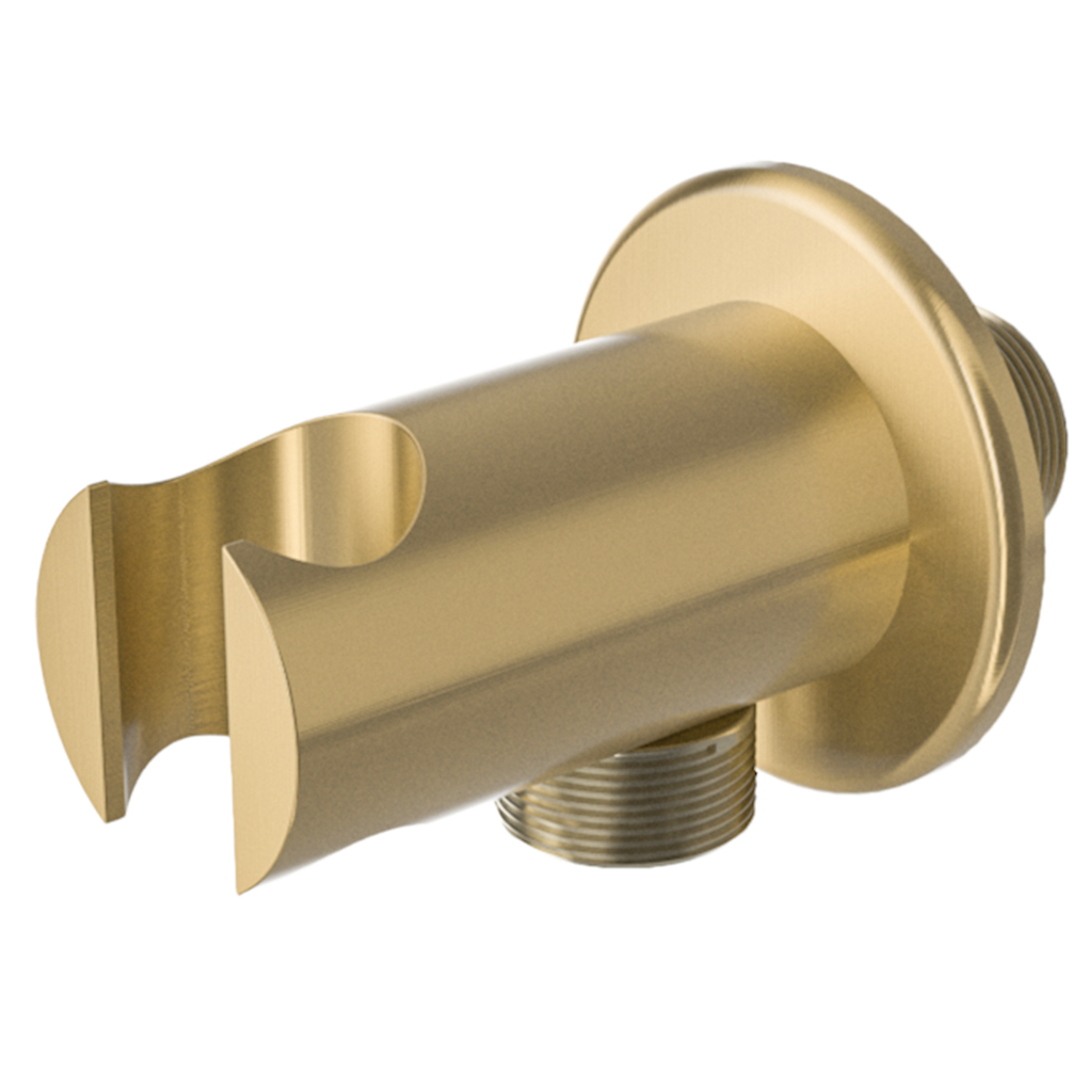 Soporte de pared con diseño redondo, perfecto para alcachofas de mano, acabado en oro mate.