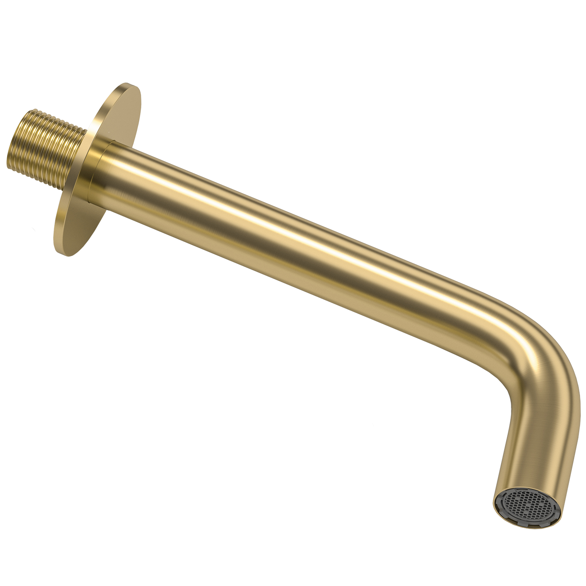 Caño redondo empotrado de 21 cm con acabado oro mate y protección PVD, ideal para lavabos con grifería empotrada.