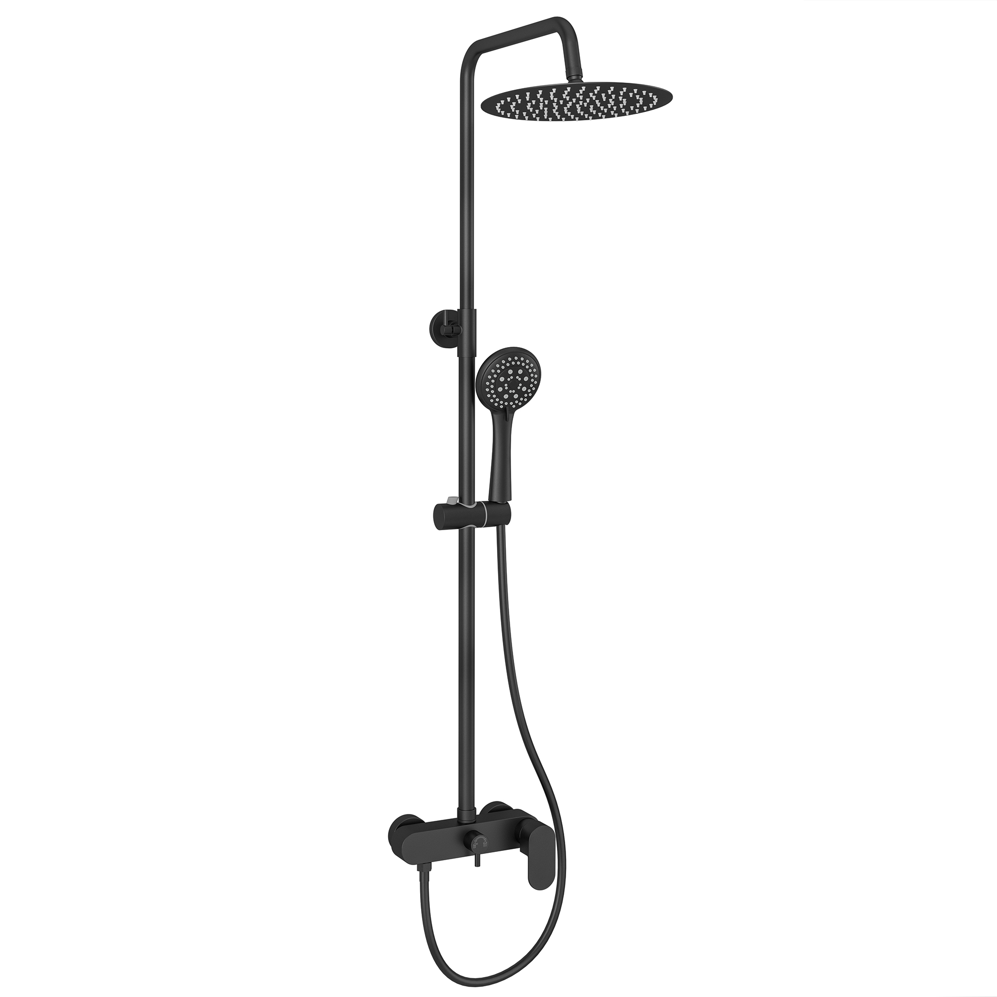 Barra de ducha monomando con diseño redondo y acabado negro mate, ideal para un baño moderno y elegante. La altura es ajustable para adaptarse a tus necesidades.