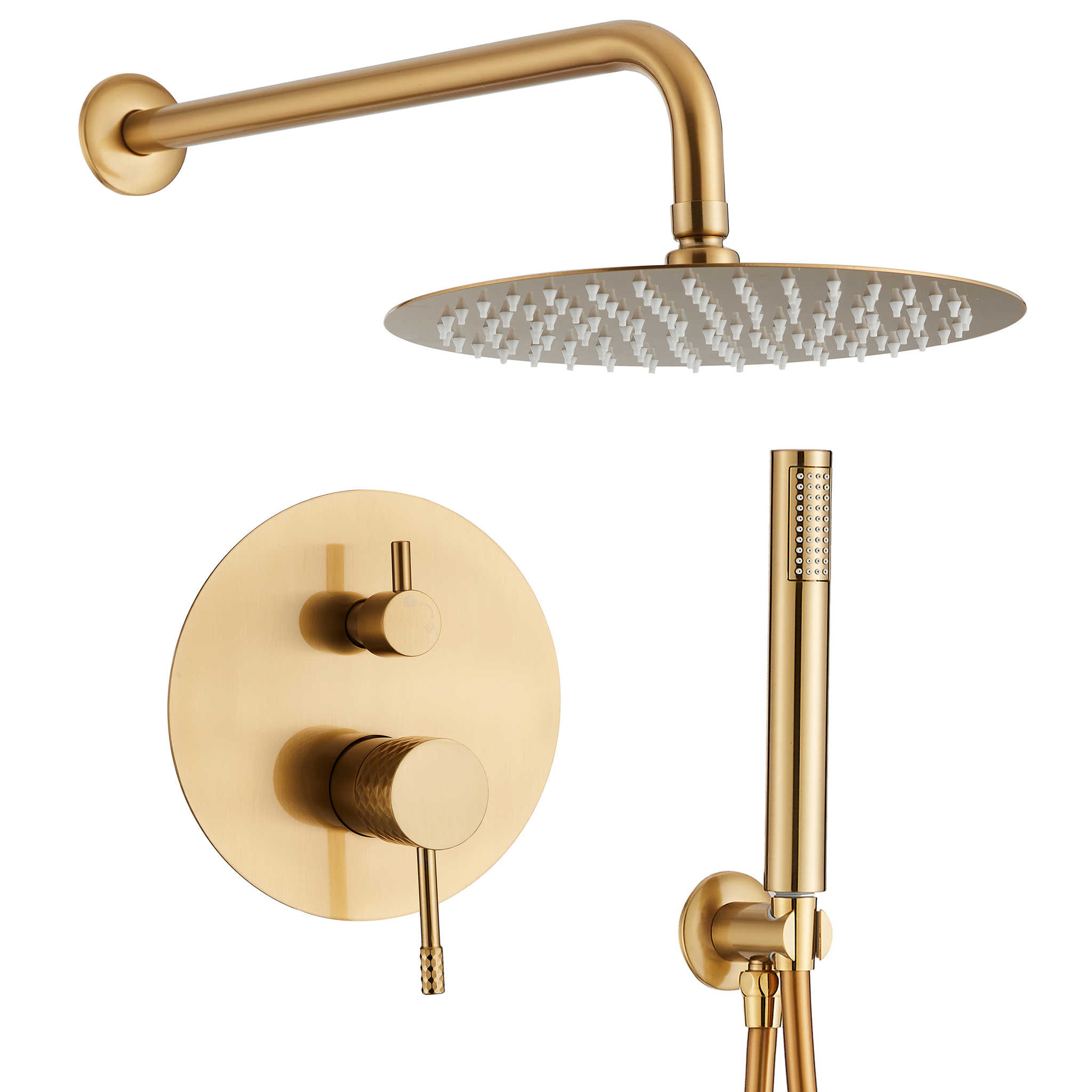 Ducha empotrada monomando con un acabado dorado cepillado que aporta un toque elegante y sofisticado a tu baño. El sistema incluye un rociador de efecto lluvia y alcachofa de mano, brindando dos opciones para disfrutar de una ducha refrescante. Su diseño de fácil instalación y materiales duraderos lo convierten en una excelente opción para baños modernos y de lujo.