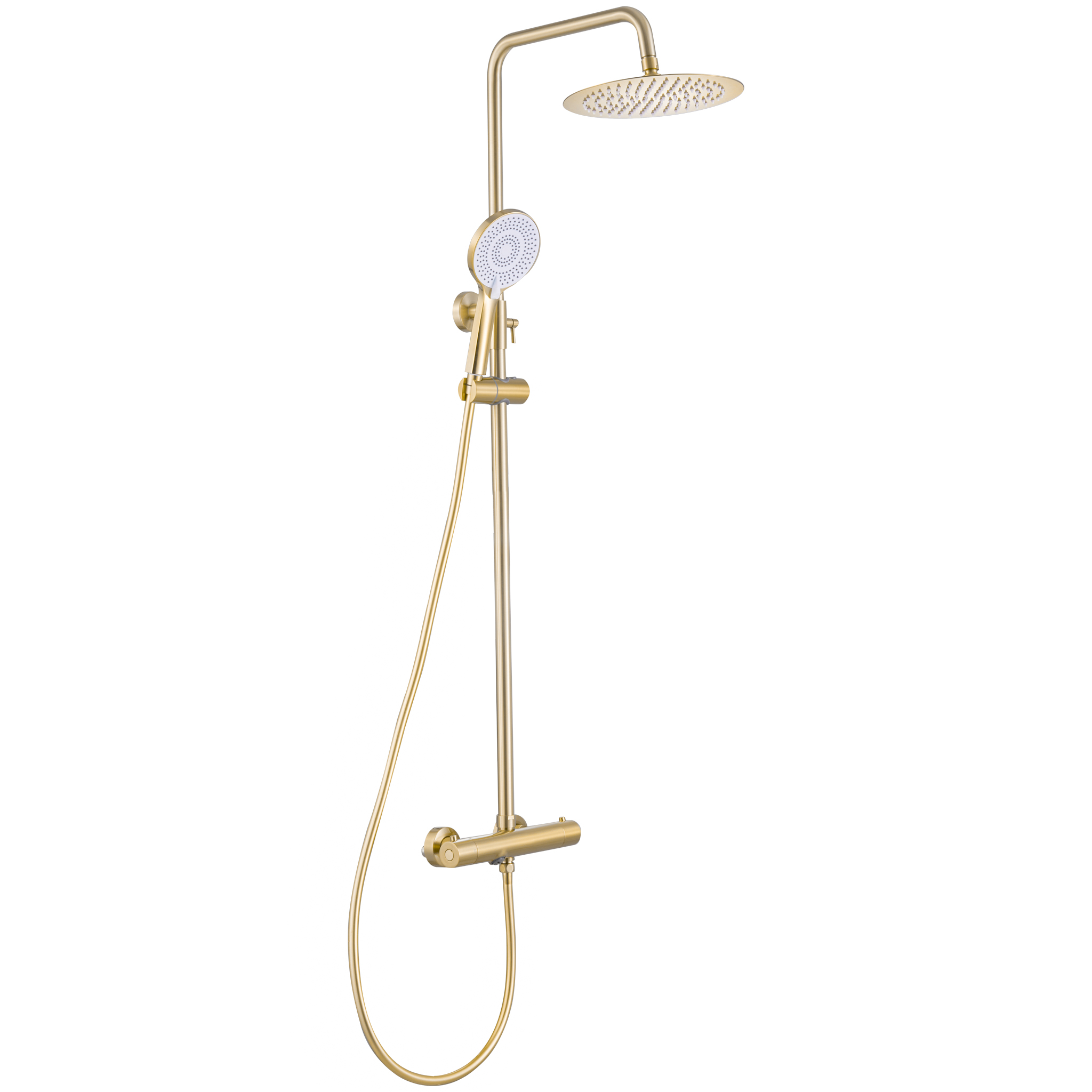 Sistema de ducha termostático con diseńo redondo y acabado en oro mate cepillado con protección PVD. Cuenta con barra ajustable en altura y rociador de acero inoxidable para una experiencia de bańo cómoda y funcional.