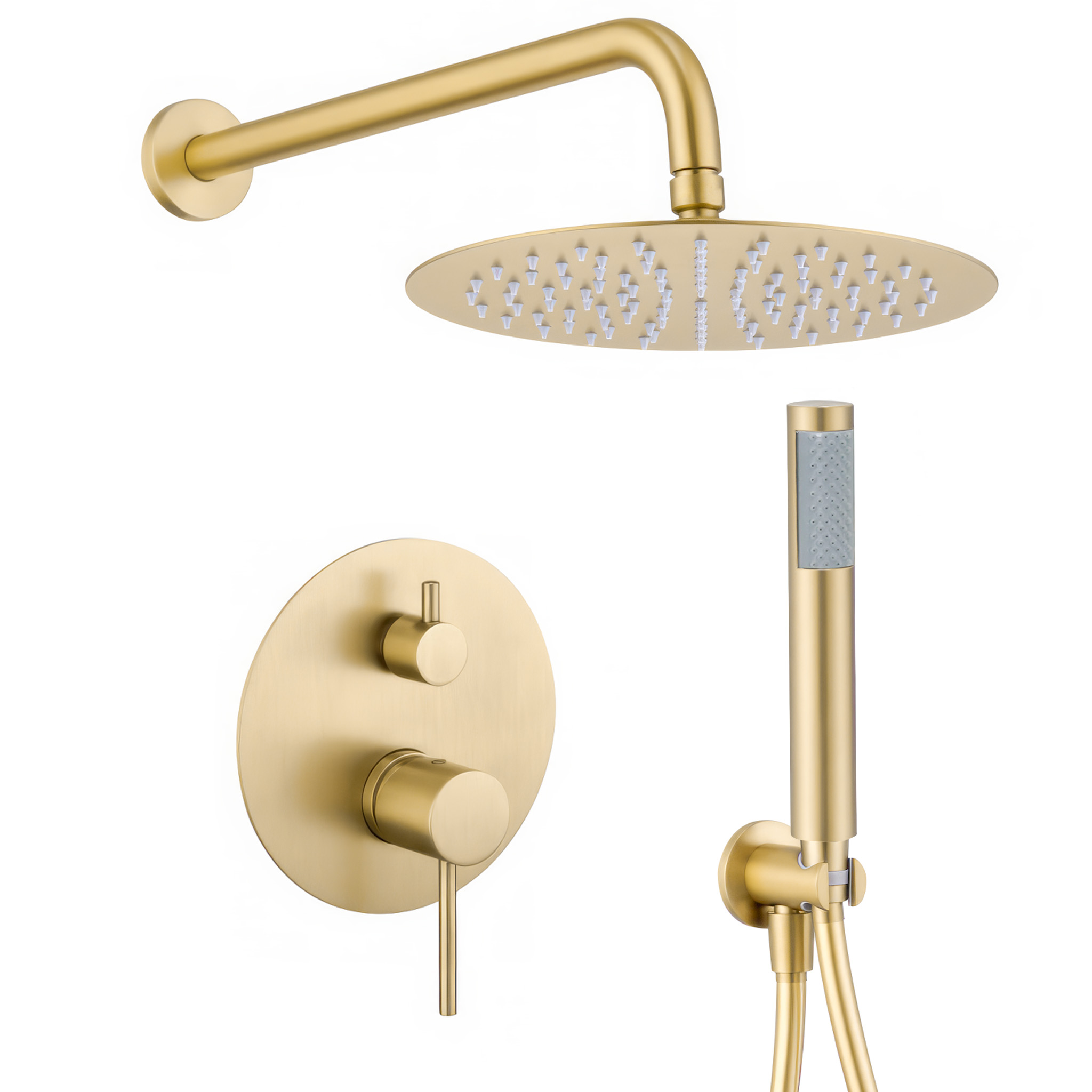 La ducha empotrada monomando redonda de la Serie Cenia combina un diseńo elegante con funcionalidad, ofreciendo un acabado oro mate con protección PVD para una mayor durabilidad y resistencia. Con su instalación empotrada a la pared, es ideal para una estética limpia y sofisticada en tu bańo.