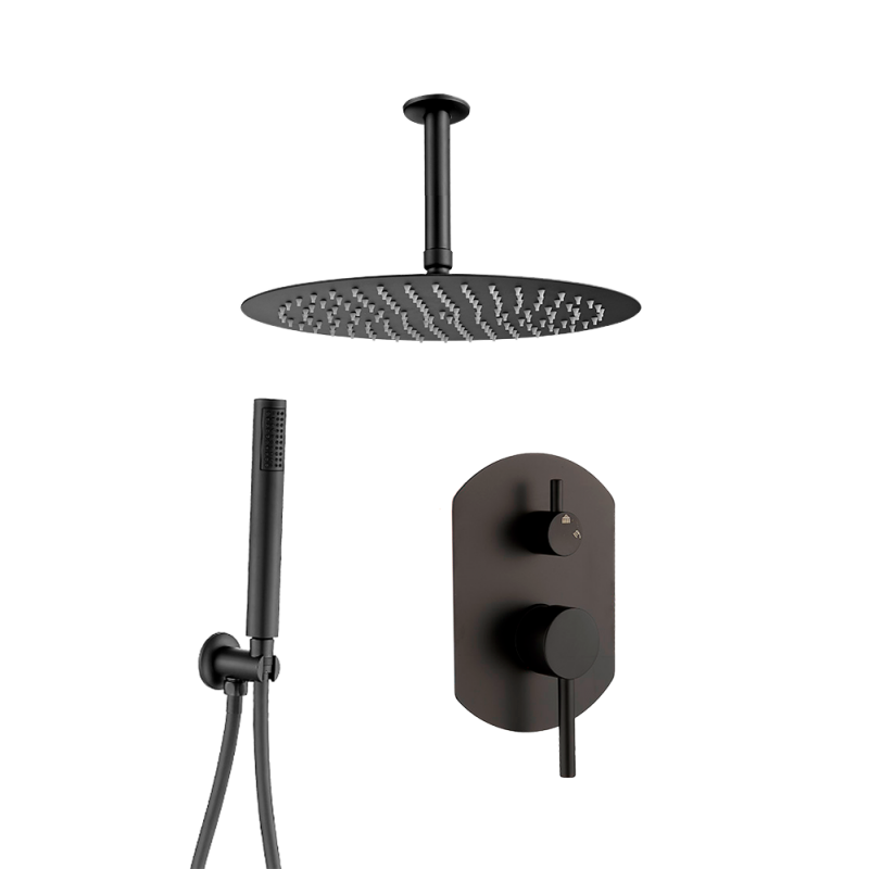 La ducha empotrada monomando ovalada con rociador redondo a techo de la Serie Duero combina un diseńo moderno y elegante con funcionalidad. El rociador, disponible en tamańos 20, 25 y 30 cm, ofrece un efecto lluvia envolvente, y el monomando de 2 vías permite seleccionar entre el rociador y la alcachofa de mano. Su acabado en negro mate aporta un toque sofisticado y contemporáneo a tu bańo.