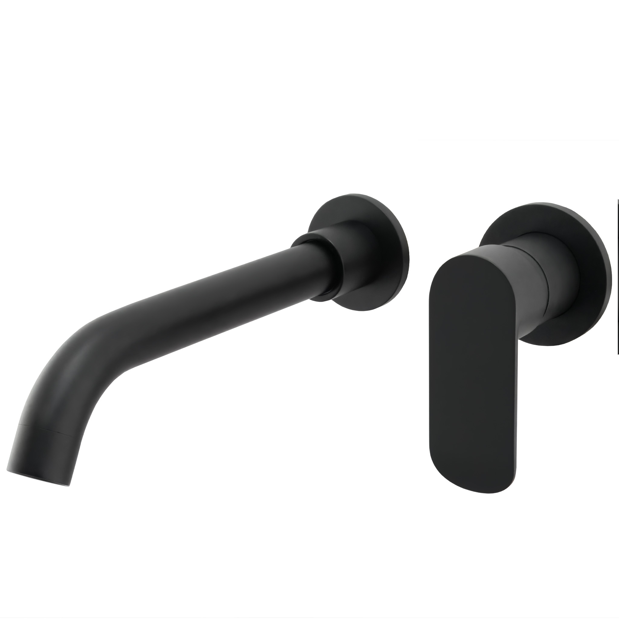 Grifo empotrado monomando de diseńo redondo, acabado en negro mate, con cańo fijo de 21 cm. Ideal para lavabos de encimera que buscan un estilo contemporáneo y elegante.