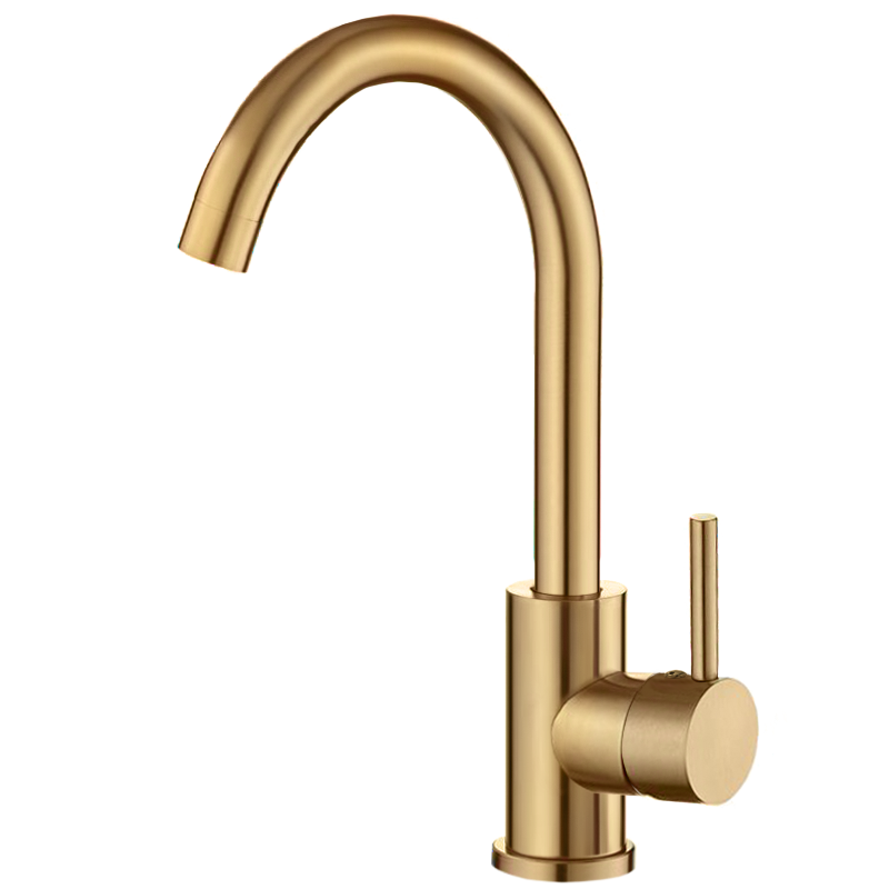 Este grifo de cocina combina un diseńo elegante en oro mate con protección PVD y un cańo corto y giratorio para mayor comodidad. Su construcción en latón y acero inoxidable asegura resistencia y durabilidad, ideal para cualquier cocina moderna.