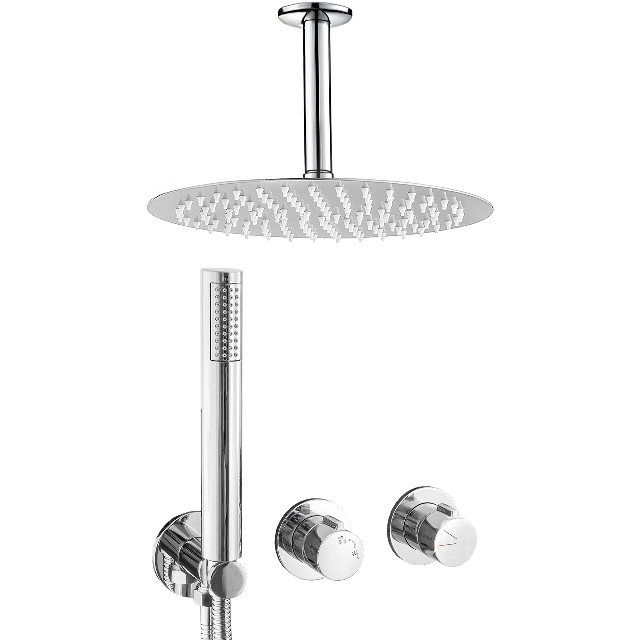 Con instalación a techo, esta ducha proporciona una experiencia envolvente gracias al efecto lluvia del rociador superior. El cuerpo monomando empotrado de 2 vías permite alternar entre el rociador de techo y la alcachofa de mano con facilidad, garantizando un uso cómodo y eficiente.