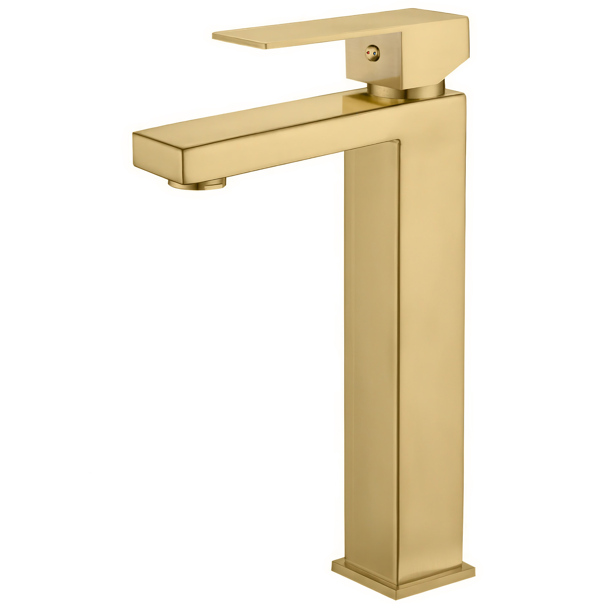 Grifo de lavabo alto para pica con diseńo cuadrado en acabado dorado cepillado. Su formato elevado lo hace perfecto para lavabos tipo bol o de encimera, aportando estilo moderno y elegancia a cualquier bańo.