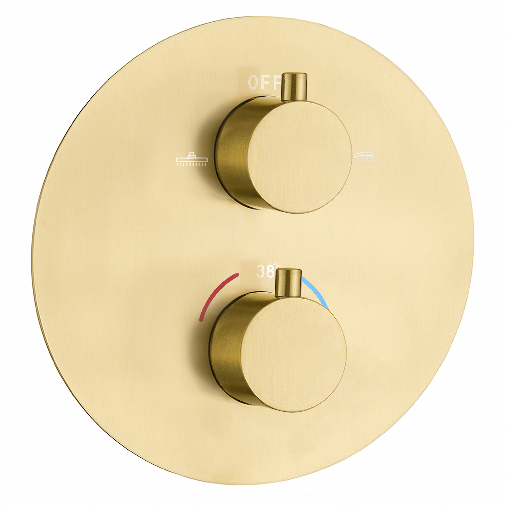 Este cuerpo empotrado termostático redondo de dos vías en acabado dorado cepillado aporta un toque elegante y lujoso a tu bańo, combinando funcionalidad con un diseńo sofisticado. Su acabado dorado cepillado resalta en espacios modernos y de lujo, brindando un ambiente único y exclusivo.