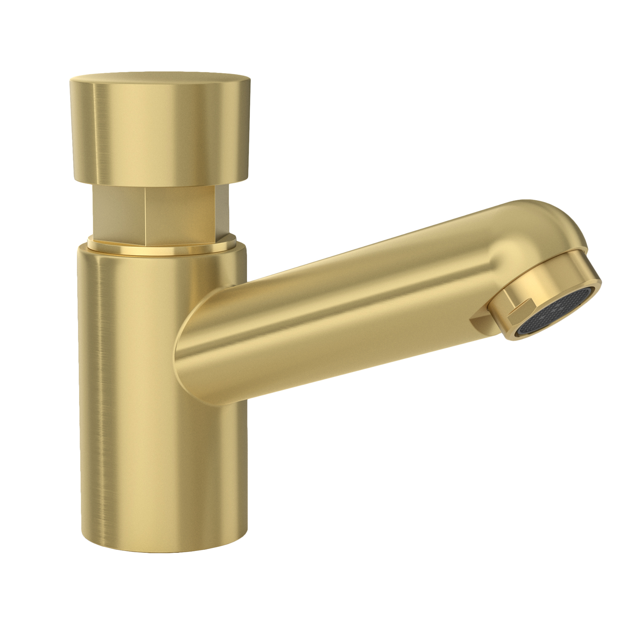El grifo de lavabo temporizador bajo en acabado oro mate de la Serie Navia es ideal para lavabos integrados o encastrados. Funciona únicamente con agua fría y está equipado con un pulsador temporizado que detiene automáticamente el flujo tras unos segundos, promoviendo el ahorro de agua. El acabado oro mate con protección PVD garantiza una excelente resistencia al desgaste.