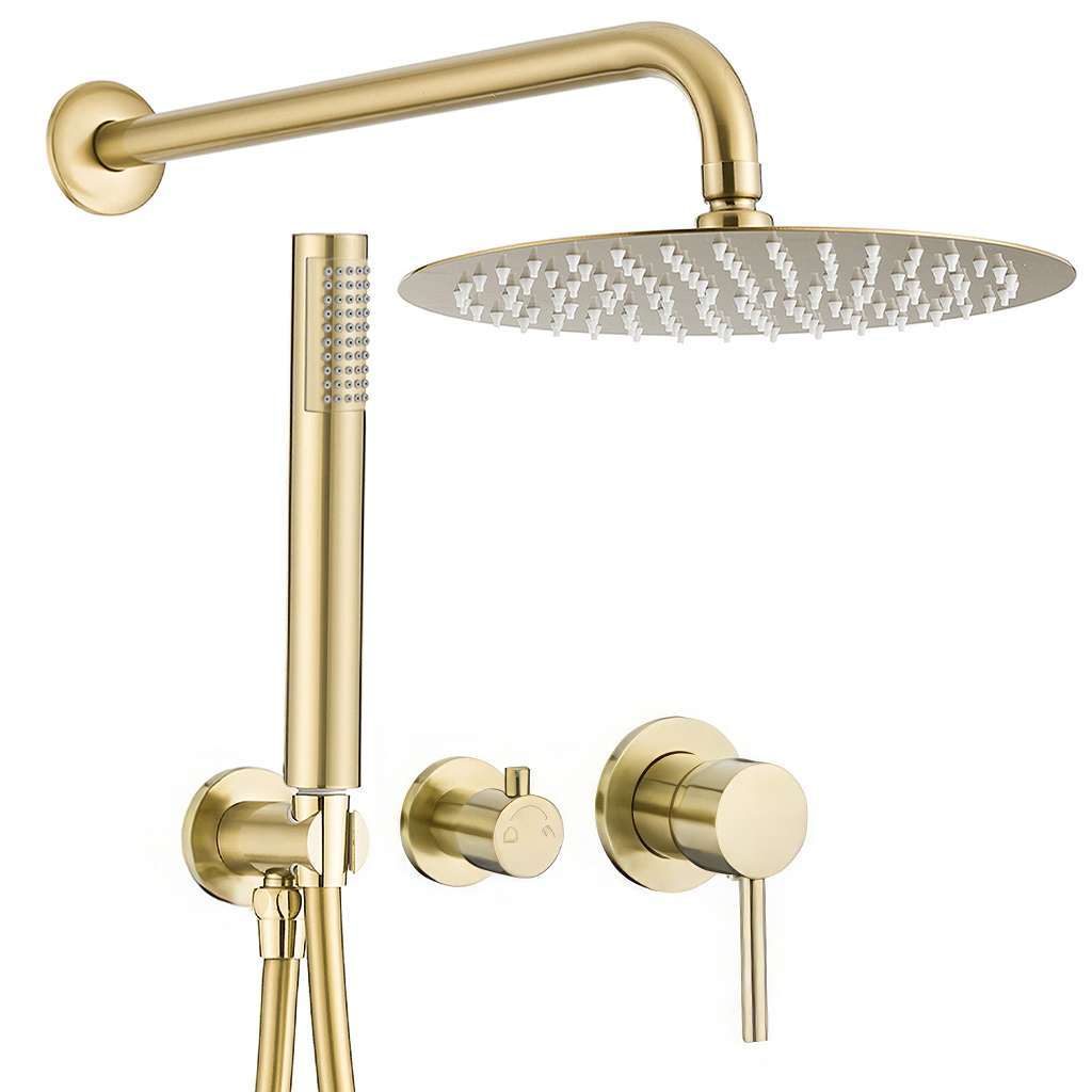 Ducha empotrada redonda con instalación a pared y elegante acabado dorado cepillado. Diseńada para ofrecer funcionalidad y estilo en un solo conjunto, cuenta con dos vías de salida que permiten elegir entre el rociador efecto lluvia y la alcachofa de mano, ideal para una experiencia de ducha versátil y moderna. Especificaciones Cuerpo de la grifería en latón Rociador de acero inoxidable Alcachofa de mano de PVC Flexo de PVC Acabado: dorado cepillado Sistema monomando de 2 vías Instalación empotrada a pared Incluye cuerpo empotrable