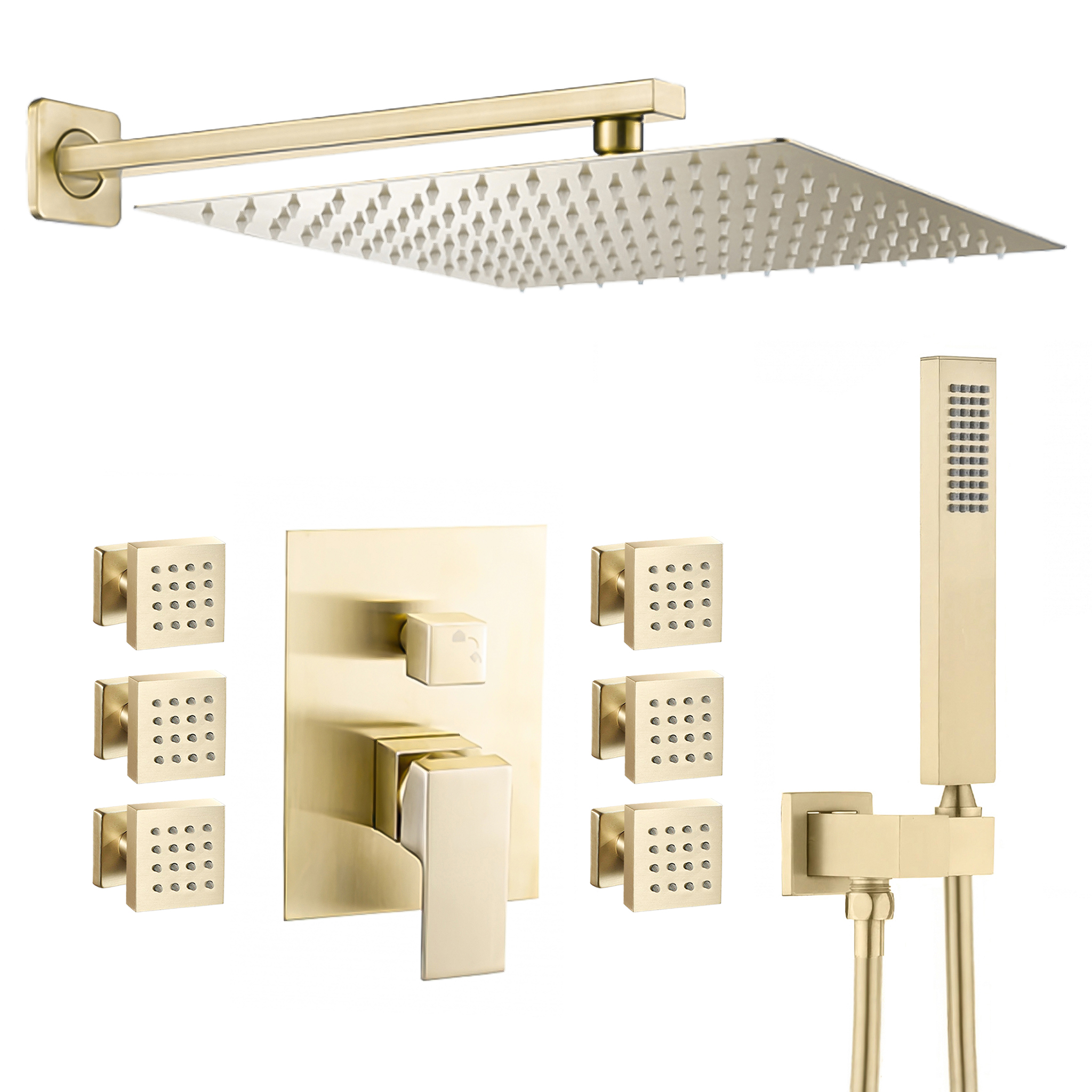 Ducha empotrada hidromasaje con 6 jets a pared cuadrada dorado cepillado - Serie Tajo - 20cm